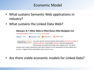 The document discusses the evolution of the web towards Web 3.0, focusing on the semantic web's characteristics, applications, and challenges in both general use and within enterprises. It outlines how semantic web technologies enable better data integration and targeted search while highlighting the existing issues like data quality and trust in the linked data ecosystem. The presentation underscores the potential for semantic web applications across various industries, including healthcare, finance, and government data publishing.