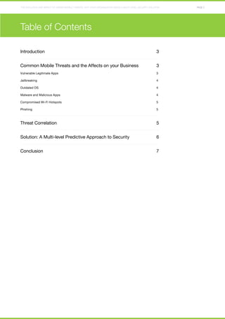 This document discusses the evolution of hidden mobile threats and why organizations need multi-level security solutions. It outlines six common mobile threats: vulnerable legitimate apps, jailbreaking, outdated operating systems, malware/malicious apps, compromised Wi-Fi hotspots, and phishing. The document recommends a predictive, multi-level approach to mobile security to address threats, protect corporate data on devices, and educate users on risks.