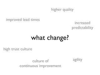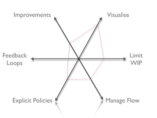 This document discusses how Kanban can be used to facilitate evolutionary organizational change. It describes Kanban as a change management system that uses visual boards and limits on work-in-progress to provoke incremental, continuous improvement. The document provides examples of how visualizing workflow and restricting work-in-progress can help align teams and processes, overcome resistance to change, and establish a culture of continuous learning.