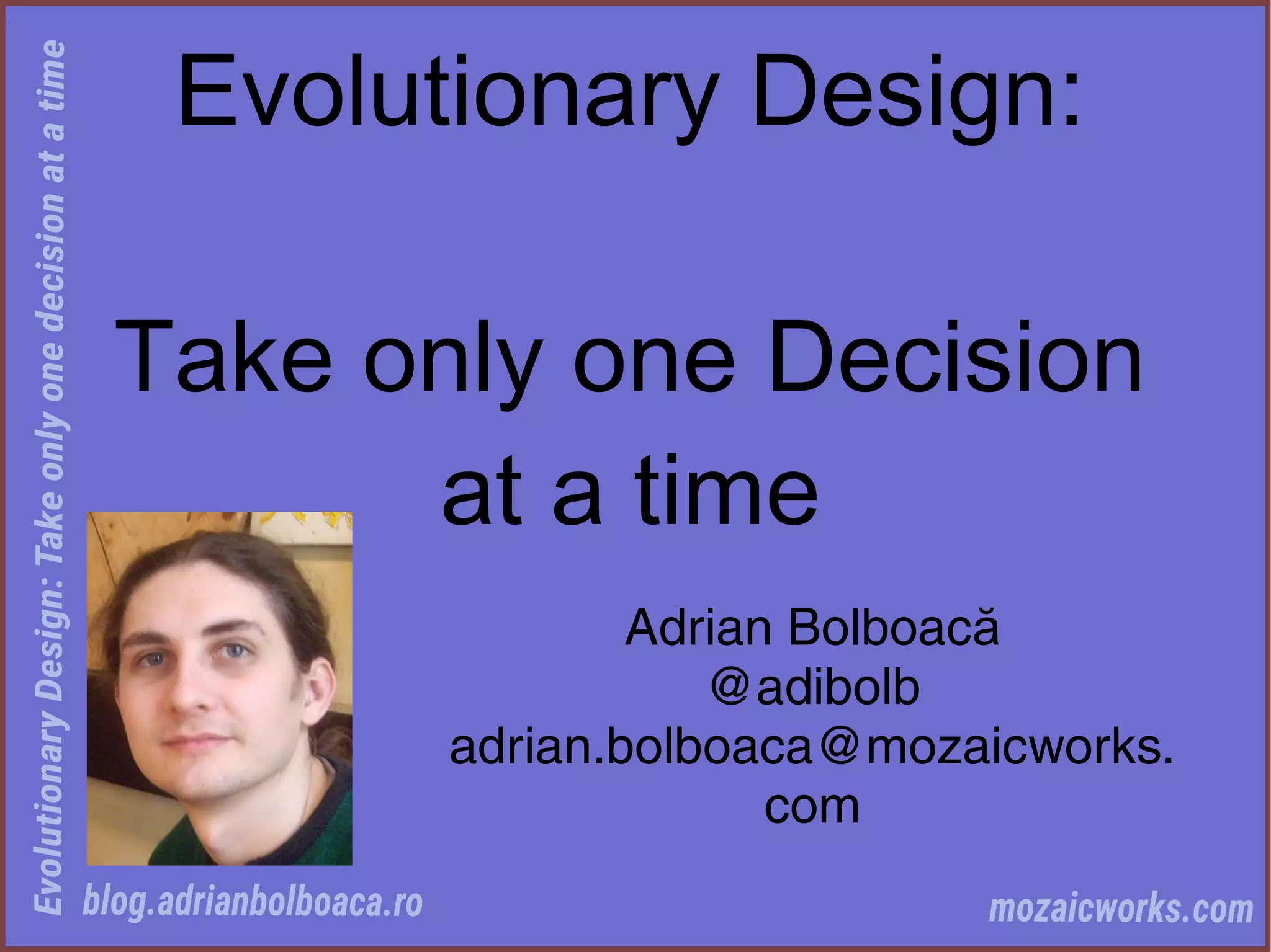 Evolutionary design is an approach to growing a system through incremental changes by observing its natural traits and optimizing its growth over time. It involves taking design decisions one step at a time by writing a failing test, making it pass in the simplest way, and choosing the next step by considering all options and their pros and cons. The tests apply pressure that molds the production code, and observing how the system evolves through this process can lead to designs that are simplified.