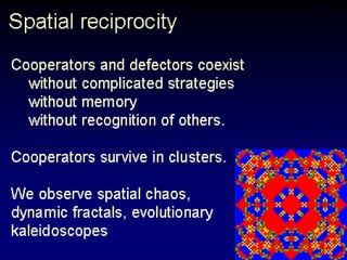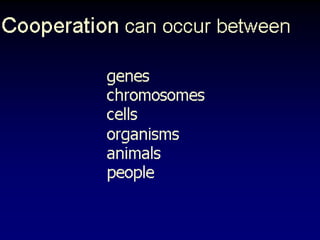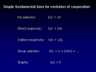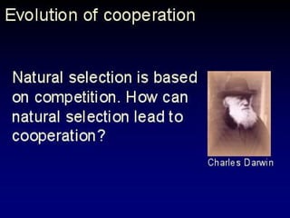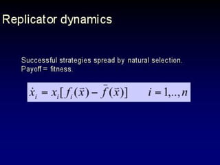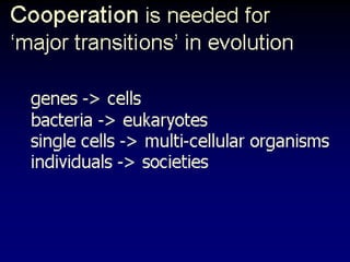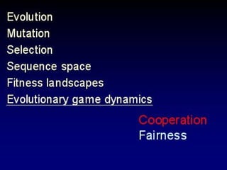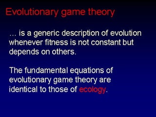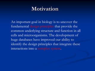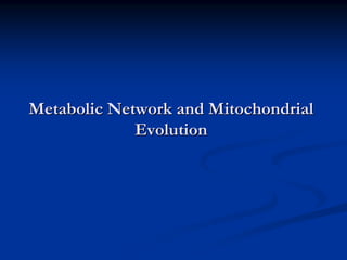 The document discusses the importance of understanding the design principles of metabolic networks and the evolutionary origins of organelles like mitochondria through the endosymbiont theory. It highlights the role of modularity in cellular functionality and the integration of complex systems, while emphasizing current research methods and ongoing investigations in the field. Additionally, it mentions a presentation on evolutionary dynamics, reflecting on concepts in evolutionary game theory.