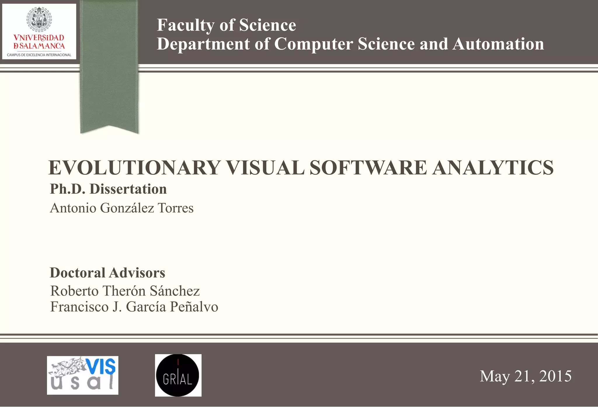 This document outlines Antonio González Torres's PhD dissertation on evolutionary visual software analytics. The dissertation was advised by Roberto Therón Sánchez and Francisco J. García Peñalvo and was presented to the Faculty of Science, Department of Computer Science and Automation on May 21, 2015. The dissertation proposes a visual analysis process for software evolution and validation studies including a systematic mapping study, survey of practitioners, and user study. It also presents several visualizations for software evolution data including timelines, revision trees, and socio-technical graphs.