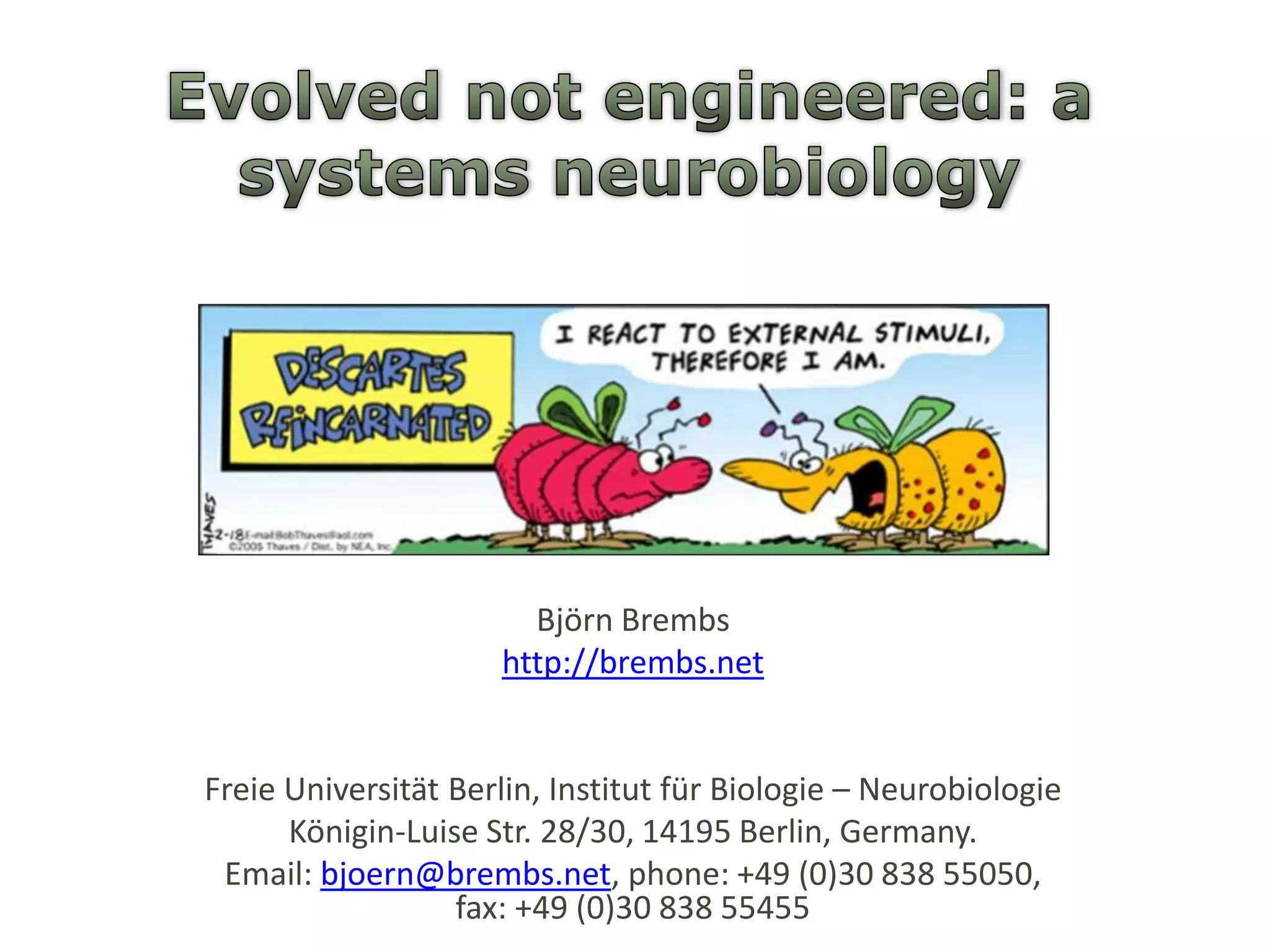 The document discusses how biological systems evolve complex gene interactions and networks in response to environmental pressures, rather than being engineered like machines, using examples from neuroscience research on fruit flies, squid, and fish to illustrate how neural systems respond to stimuli in variable and adaptive ways. It also examines theories of how biological systems achieve robustness through degeneracy and maintain behavioral variability through multiple learning systems that balance exploitation and exploration.