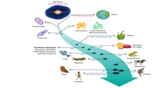 It then provides a timeline for the major developments of life on Earth from its earliest origins over 4 billion years ago to the emergence of modern humans around 200,000-250,000 years ago. Key events included the first prokaryotes, cyanobacteria that generated oxygen