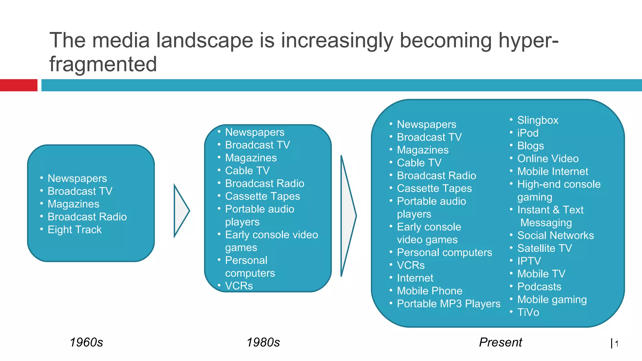 The media landscape is becoming highly fragmented as consumers now have more control over what media they consume through various new technologies. Consumers are able to both access existing content from multiple sources and create and share their own content. This has led to disruptions in traditional media business models as consumer behavior shifts towards on-demand, short-form, and social media consumption across multiple platforms.
