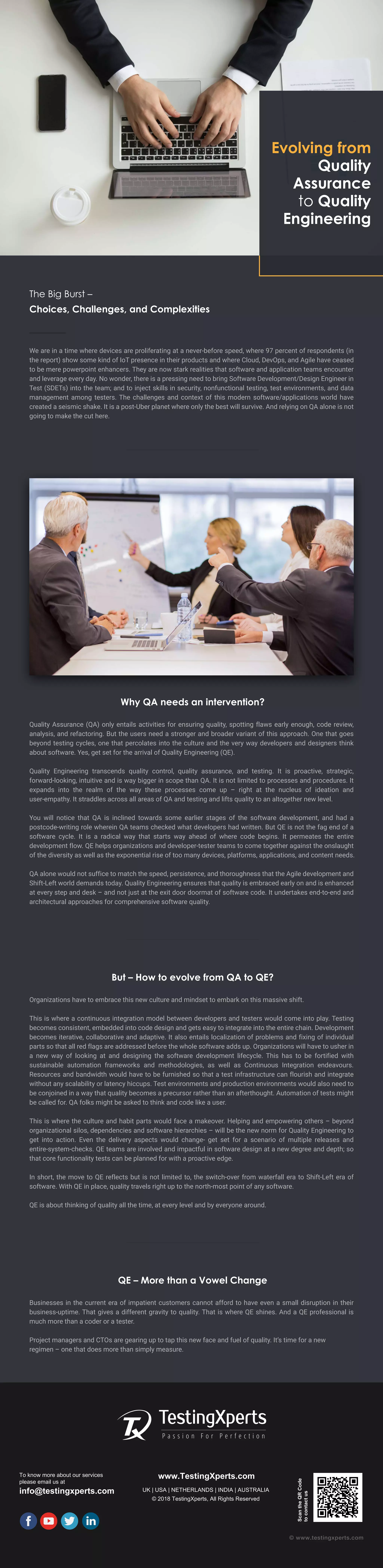The document discusses the evolution from Quality Assurance (QA) to Quality Engineering (QE), emphasizing the need for a more proactive and integrated approach to software quality in the rapidly changing tech landscape. It highlights that QE goes beyond traditional QA by embedding quality throughout the entire software development process and encourages organizations to adopt a culture that embraces continuous integration and collaboration between developers and testers. Ultimately, QE is portrayed as essential for achieving high-quality standards and meeting the demands of modern applications and user expectations.
