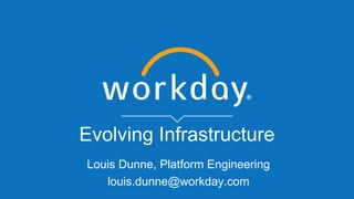 The document discusses Workday's infrastructure evolution, emphasizing their cloud architecture, integration of Chef for configuration management, and the importance of a robust build and test pipeline. It details deployment methods including image-based and chef/cobbler deployments, highlighting the push-button deployment framework for applications and environments. The emphasis is on reliability, speed, and the management of both planned and unplanned changes through systematic image deployments.