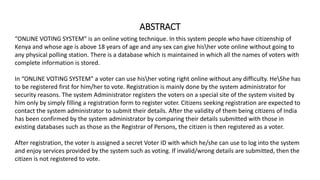This document summarizes a presentation on an online voting system for Kenya. It describes how the system would allow eligible Kenyan citizens over 18 to vote online by registering in a voter database managed by a system administrator. After registering, voters would be assigned a secret ID to log in and vote without going to a physical polling station. The document outlines the software, hardware, advantages, and disadvantages of the system. It also discusses feasibility analysis, algorithms, activity diagrams, and overall goals of ensuring security, transparency, and inclusion for electronic voting.