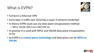 EVPN is an Ethernet VPN technology that extends layer 2 networks over a layer 3 underlay. It uses BGP as the control plane to distribute MAC addresses and Ethernet segment information between provider edge (PE) devices. EVPN supports various data plane encapsulations like MPLS, VXLAN, and NVGRE. It provides an integrated solution for layer 2 and layer 3 VPNs that addresses scaling challenges in traditional VPLS deployments.