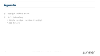 The document discusses Ethernet VPN (EVPN) functionality on Juniper Networks devices. It provides an overview of EVPN concepts including single-homed and multi-homed EVPN configurations, the differences between EVPN and VPLS, Junos support for EVPN, EVPN terminology, types of BGP routes used in EVPN, MAC learning processes, and trace log examples.