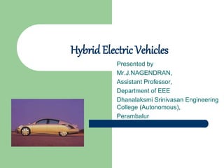 Hybrid electric vehicles combine a conventional internal combustion engine system with an electric propulsion system. This allows the vehicle to be powered by both sources, maximizing fuel efficiency and reducing emissions. The key components of a hybrid system include electric motors and controllers, energy storage such as batteries, and a transmission. Hybrids use a parallel or series configuration where the electric motor can assist the engine or act as the primary propulsion source. Examples of successful hybrid models are the Toyota Prius and Honda Insight, which achieve over 50 mpg due to regenerative braking and optimal engine performance. Ongoing challenges include improving energy storage and efficiency of power conversion from fuel to useful energy.