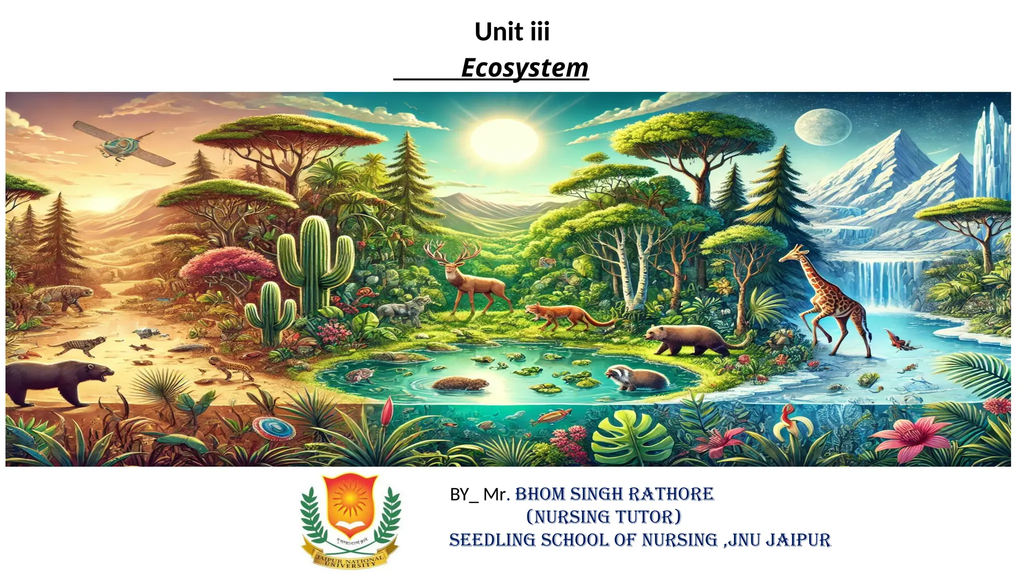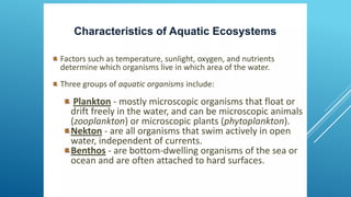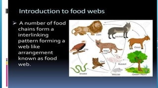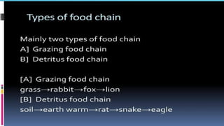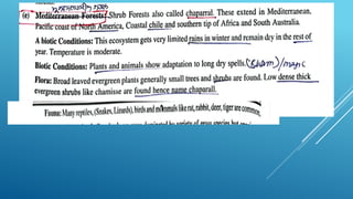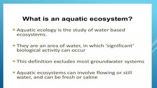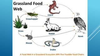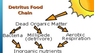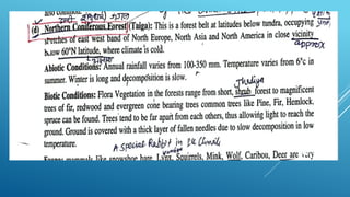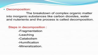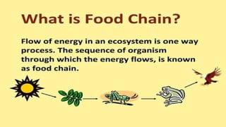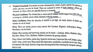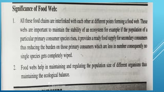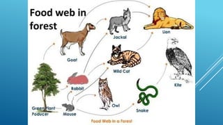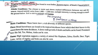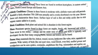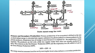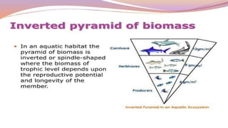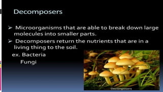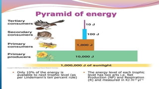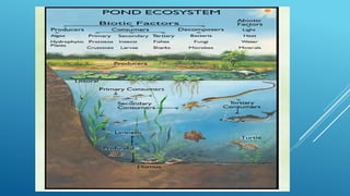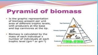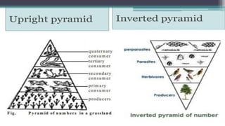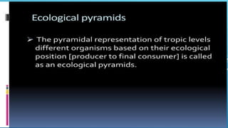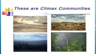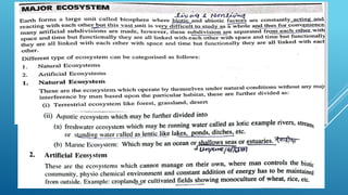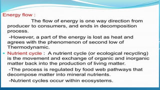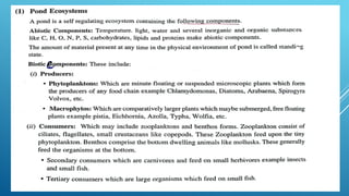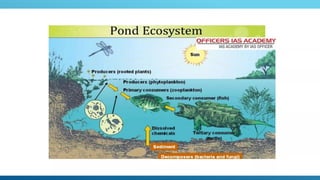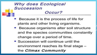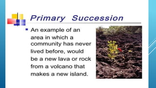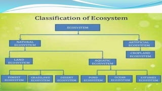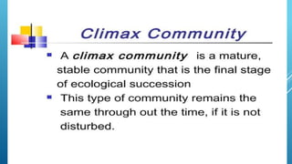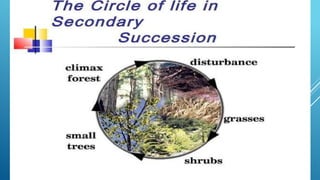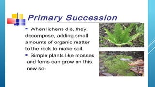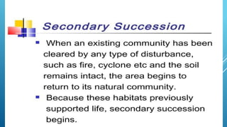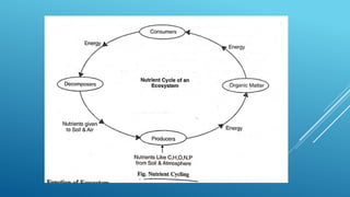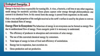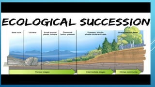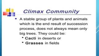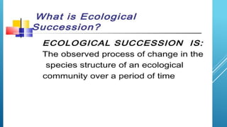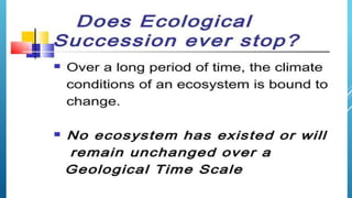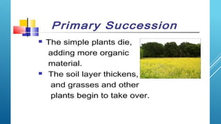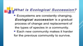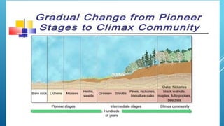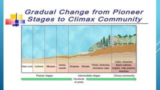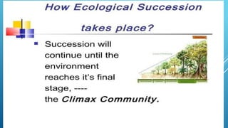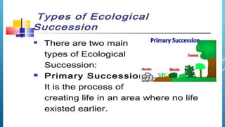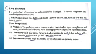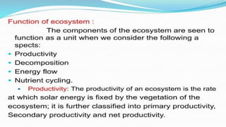The document provides an overview of ecosystems, defining them as systems comprising biotic (living) and abiotic (non-living) components. It details the roles of producers, consumers, and decomposers within ecosystems, alongside descriptions of various components, including climatic, organic, and inorganic factors. Additionally, it touches on concepts such as ecological succession, illustrating the progressive changes in species composition over time.