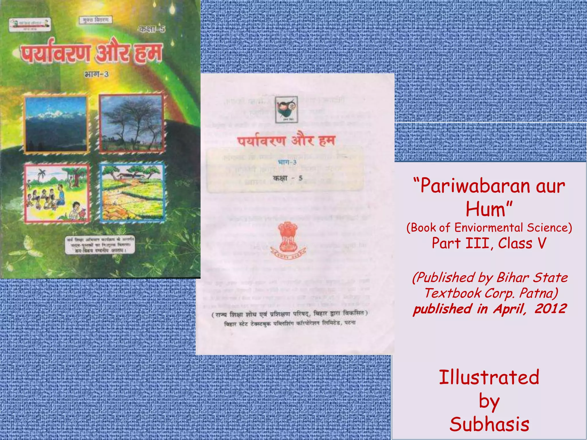 This document provides publication details for a textbook titled "Pariwabaran aur Hum" which is part of an environmental science book for Class V students published by the Bihar State Textbook Corporation in Patna, India in April 2012. The textbook was illustrated by Subhasis.