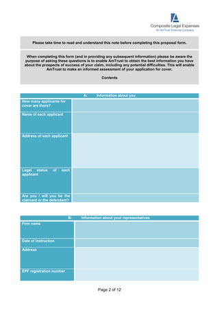 This proposal form requests information from an applicant seeking commercial litigation insurance. It requests details about the applicant and their legal representatives, estimates of costs and the coverage sought, information about the opposing party and their representatives, and details of the claim including the nature of the dispute, evidence, damages, defenses, settlement prospects, costs awards, and enforcement. The applicant is asked to provide documentation to support their costs estimates and a breakdown of anticipated legal costs and funding arrangements. The purpose is to allow the insurer to assess the risks and make an informed decision about the application.