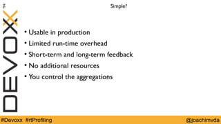The document discusses simple runtime profiling techniques that provide limited overhead and feedback without additional resources. It describes profiling REST calls and JDBC calls using containers and aggregating data. Alternatives like XRebel and Metrics are also mentioned.