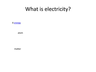 Electricity is a form of energy that is measured in amps and can be generated from sources like lightning, the sun, and movement of matter. However, the document contains many incorrect or irrelevant terms and sections.