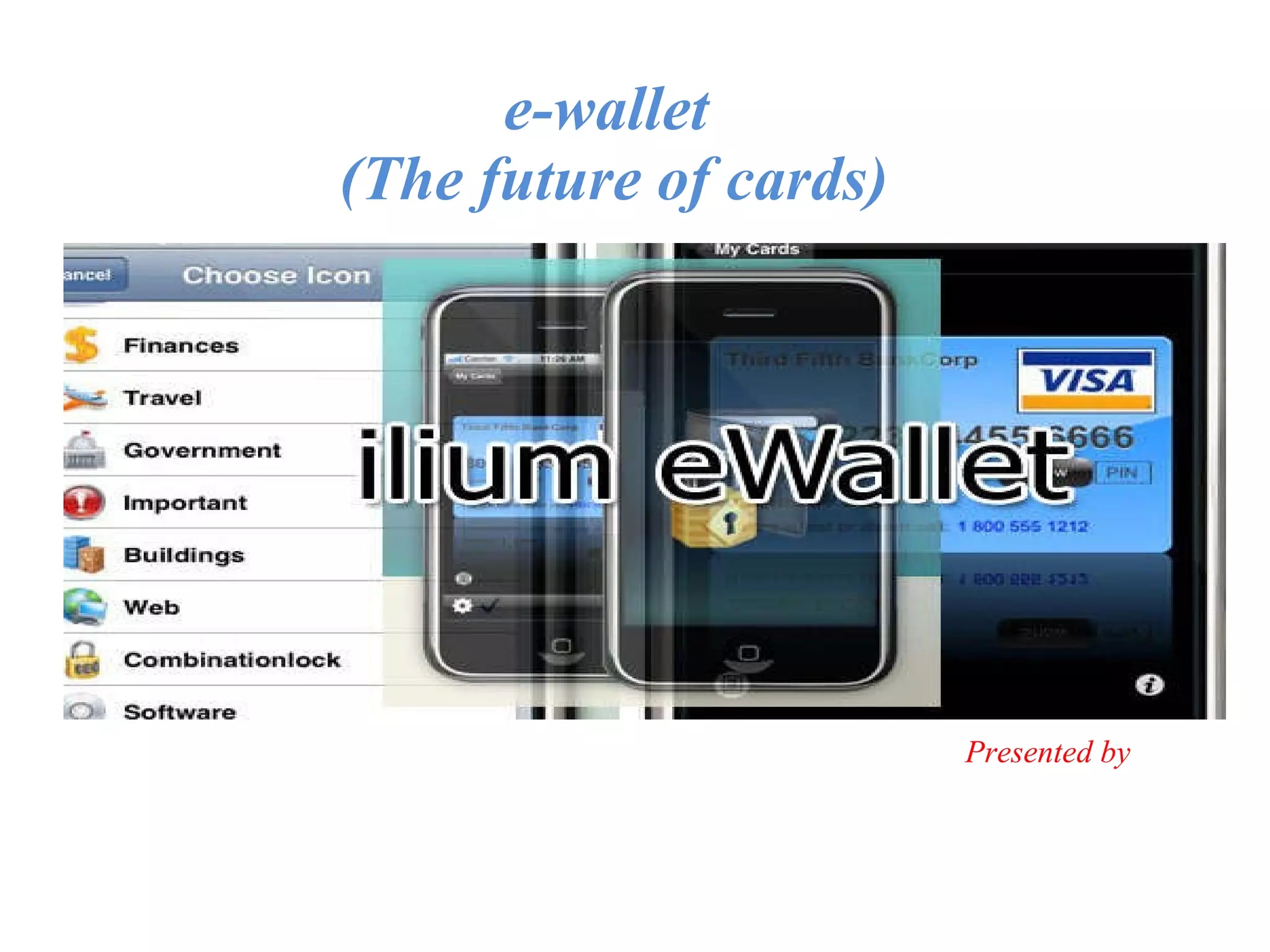 The document discusses e-wallets as a future replacement for traditional cards. E-wallets use smart card technology with microprocessor chips that allow for processing of multiple applications. They have advantages over traditional cards like unlimited lifetime, ability to store balances, and universal acceptance. E-wallets are supported on platforms like Windows PC, Apple iOS, Blackberry, and Windows Mobile devices to enable paperless money transactions more easily than traditional cards.