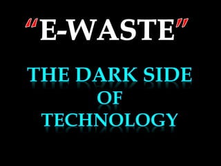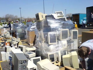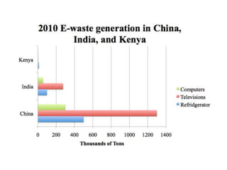 The document discusses the increasing reliance on electronic products and the resulting rise in electronic waste (e-waste), which poses significant environmental and health risks due to improper disposal methods. It highlights the growing e-waste crisis in both international contexts, particularly in the USA and the EU, and within India, where major cities generate substantial amounts of e-waste. The document calls for improved recycling and disposal methods, as well as greater public awareness and regulatory measures to mitigate the adverse effects of e-waste.