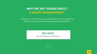 The document emphasizes the importance of e-waste management in India, highlighting that the country is the fifth largest generator of electronic waste, producing over two million tonnes annually. It details the harmful constituents found in e-waste and stresses the need for proper recycling through authorized recyclers to mitigate health and environmental risks. Additionally, it outlines the benefits of recycling, including resource conservation and community support, while providing guidelines for safe disposal practices.