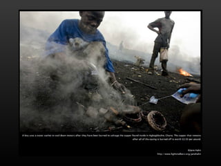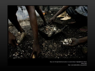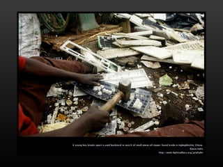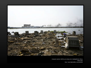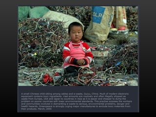 Electronic waste is a growing problem around the world. Greenpeace warns of large amounts of e-waste in the Philippines that poses health and environmental risks if not disposed of properly. Pictures show electronic scraps in Manila dump sites and computer monitors awaiting purchase from scrap dealers.