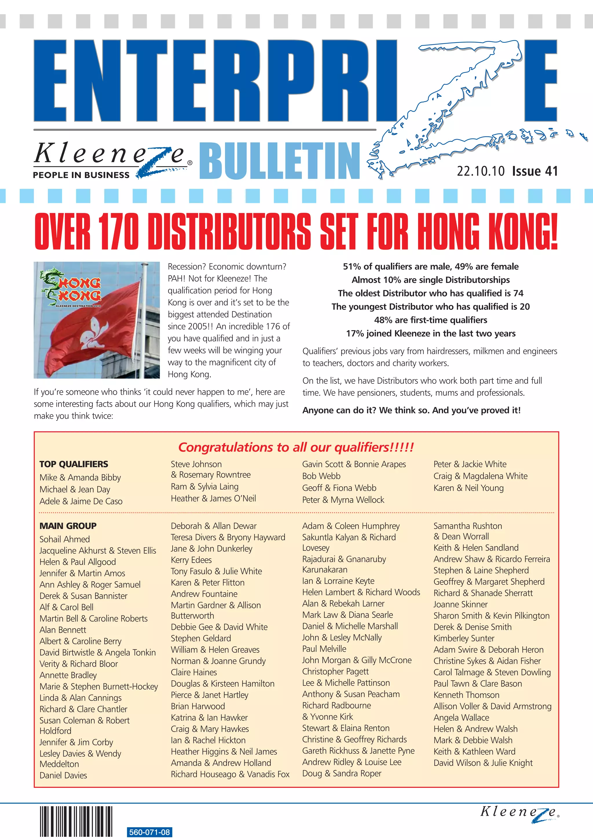 This bulletin provides information about Kleeneze distributors who have qualified to attend an upcoming destination trip to Hong Kong. Over 170 distributors from a variety of backgrounds qualified. Details are provided about the demographics of the qualifiers, including their gender, age range, length of time with Kleeneze, and previous occupations. The bulletin celebrates the achievement of these distributors qualifying for the trip.