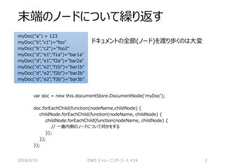 The document discusses iterating through the leaf nodes of a nested document structure. It explains that using forEachLeafNode allows iterating through just the terminal nodes with values in one pass, rather than requiring multiple nested loops to traverse the entire structure. forEachLeafNode calls a callback function, passing the value and leaf node object for each terminal node. This avoids inefficiently traversing all nodes and allows early termination by returning true from the callback.