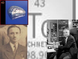 Technetium is an artificial radioactive metal that was the first element synthesized. It was discovered in 1937 by Emilio Segre and Carlo Perrier in Italy. Technetium has properties such as a melting point of 2,200°C, boiling point of 4,877°C, and silver color. It is not commonly found on Earth but is found in some red giant stars. Technetium is mostly created in nuclear reactors and is used as a tracer in medicine and to inhibit corrosion in steel.