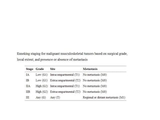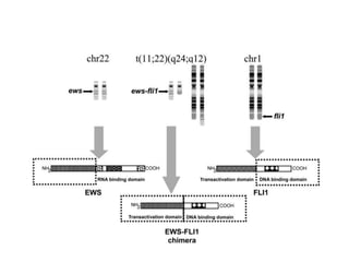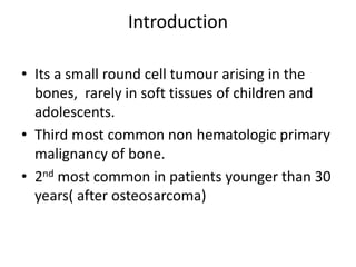 Ewing sarcoma is a rare cancer that develops in bone or soft tissue. It is most common in children and young adults between ages 10-20. The cancer cells are small, round cells and are usually found in the bones of the legs, pelvis, ribs, or spine. Ewing sarcoma is treated with a combination of chemotherapy, radiation therapy, and surgery. Prognosis depends on factors like tumor size, location, and whether the cancer has spread. With current multi-agent chemotherapy regimens, long-term survival rates are around 60-70%.