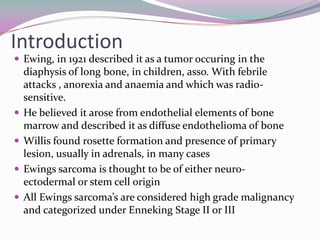 1) Ewing's sarcoma is a rare type of cancer that affects bone or soft tissue. It was first described in 1921 and is thought to arise from stem cells or nerve tissue.