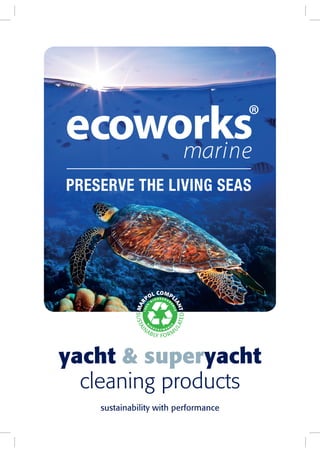The document describes Ecoworks Marine's line of sustainable cleaning products for yachts and superyachts. The products are formulated with naturally derived ingredients and are biodegradable, phosphate-free, and compliant with IMO MARPOL regulations to minimize environmental impact. The products can clean surfaces like fiberglass, teak, engines, fabrics, glass and more while tackling dirt and stains.