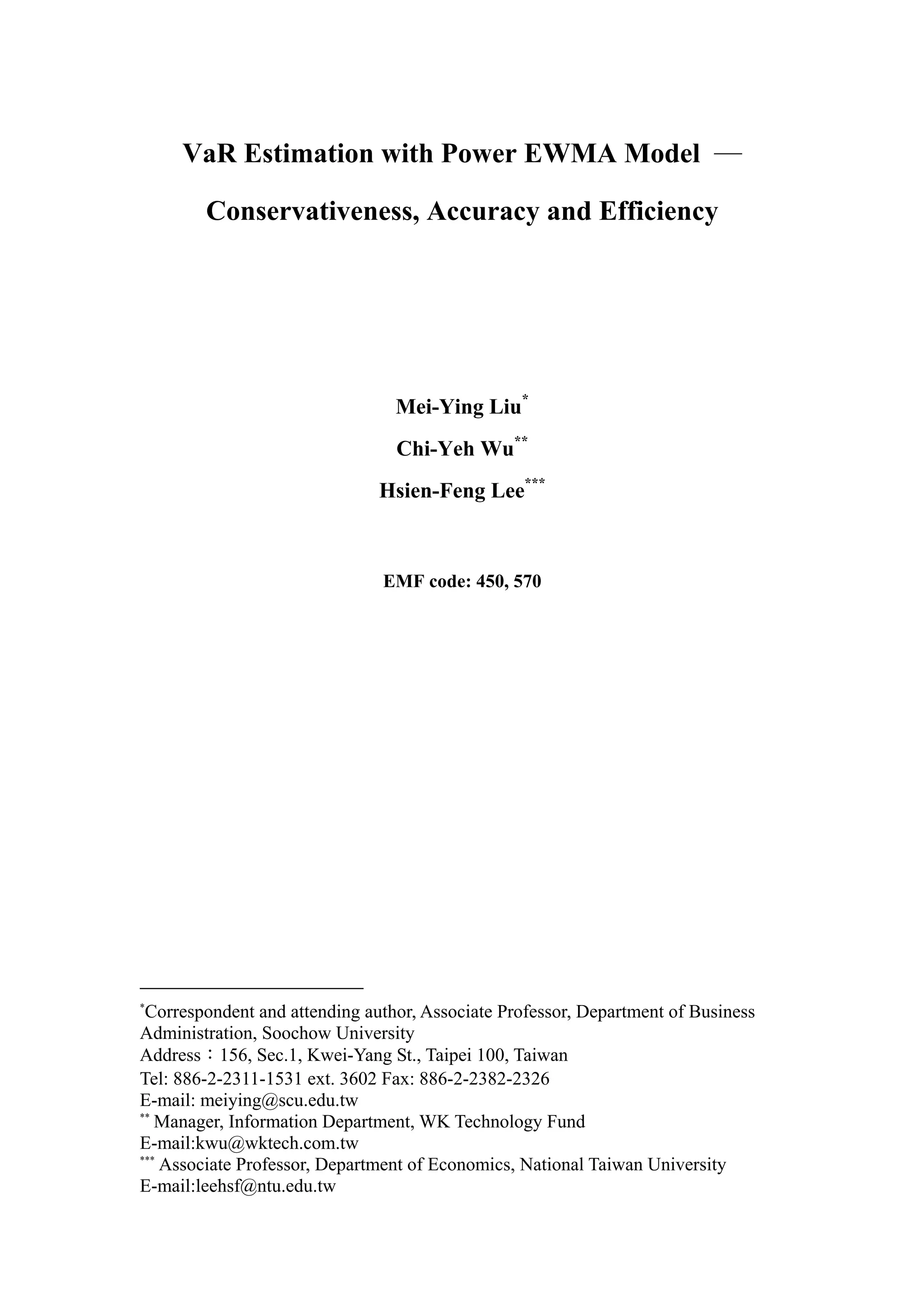This document proposes using a family of nested power EWMA estimators based on an exponential power distribution to estimate VaR. It summarizes previous research showing that asset returns are often fat-tailed rather than normally distributed. The power EWMA model nests standard EWMA, robust EWMA, and power EWMA estimators. The document empirically evaluates the conservativeness, accuracy, and efficiency of these models when estimating the VaR of several stock market indices, using measures that address each criterion. The results show that power EWMA and related estimators offer superior coverage of extreme risks compared to standard EWMA, and accurate VaR estimation.