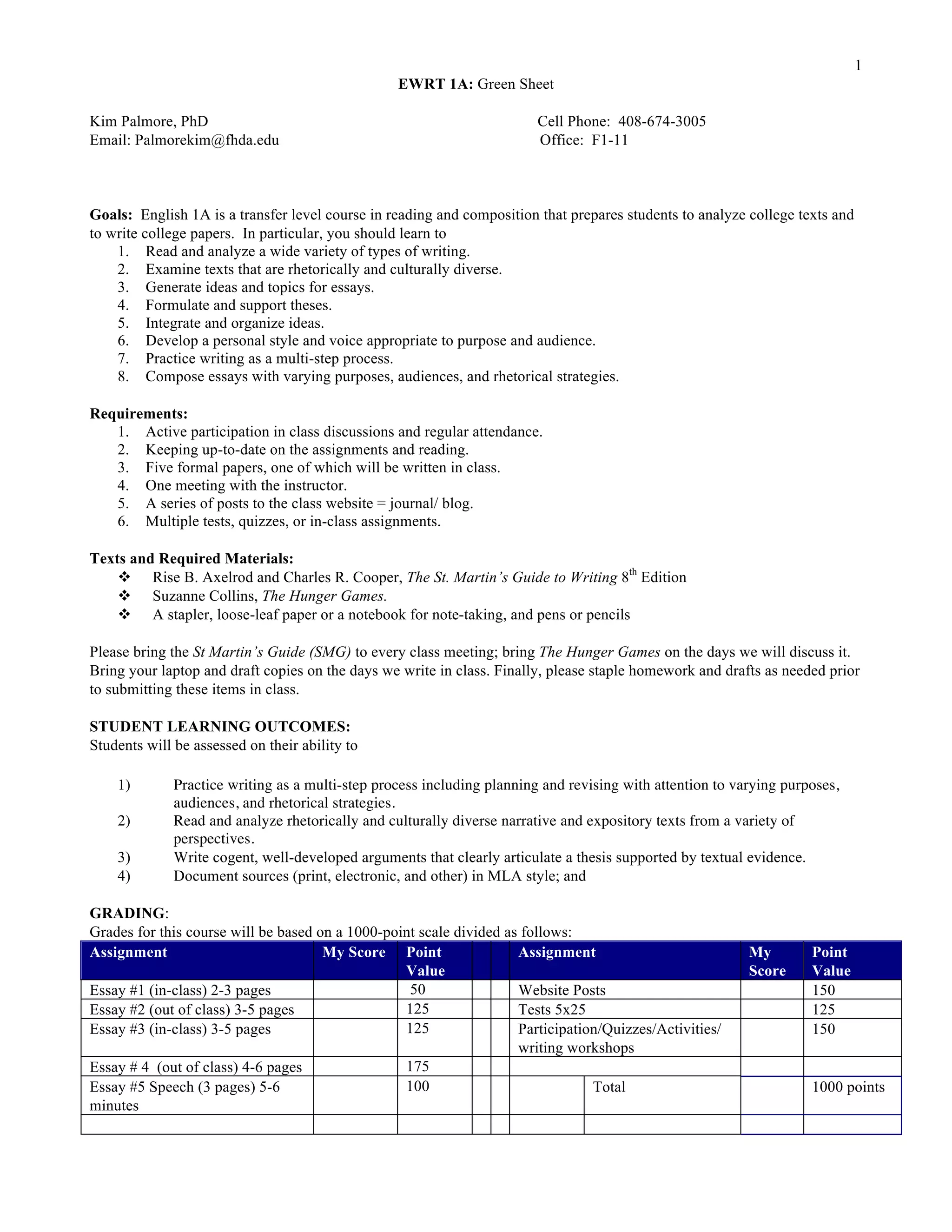 This document provides an overview of the goals, requirements, texts, grading, and policies for an English 1A course. The course aims to prepare students to analyze college texts and write papers. Key requirements include 5 formal papers, weekly posts to a class blog, and tests/quizzes. Grades are based on a 1000 point scale divided among essays, blog posts, tests, and other assignments. Course policies address issues like attendance, academic dishonesty, late work, and use of student papers. The primary texts are The St. Martin's Guide to Writing and The Hunger Games novel.