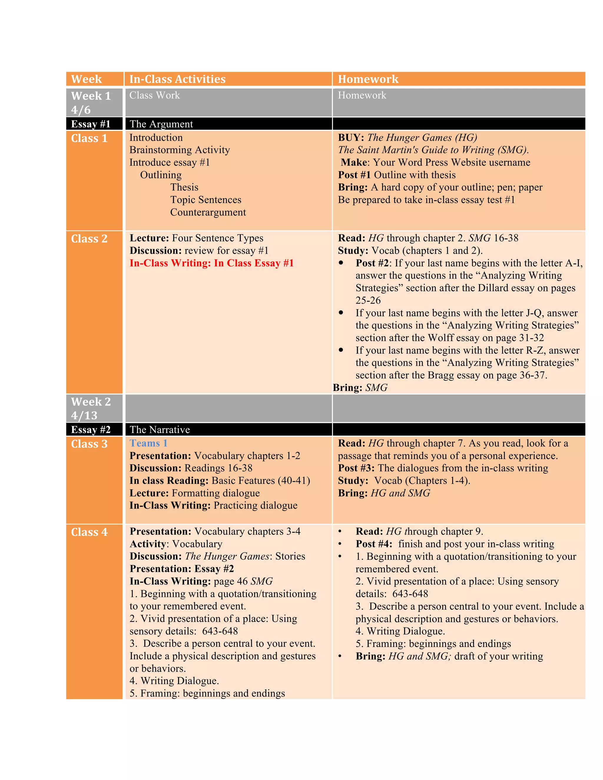 This document provides an overview of the weekly schedule and assignments for an English composition course. It includes in-class activities, homework assignments, and due dates for four major essays: The Argument, The Narrative, The Concept Essay, and The Problem/Solution Essay.