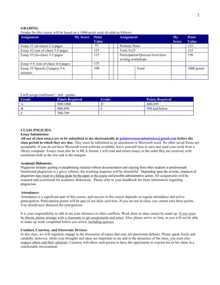 This document provides information about an English 1A course including contact information for the instructor, goals of the course, requirements, grading policies, and other policies. The main goals of the course are to prepare students to analyze college texts, write college papers, and develop writing skills. Requirements include 5 formal papers, blog posts, tests, and participation. The grading is based on 1000 points from assignments like essays, tests, and activities. Policies cover submission of essays, academic dishonesty, attendance, conduct, workshops, quizzes, tests, late work, and adding/dropping the course.