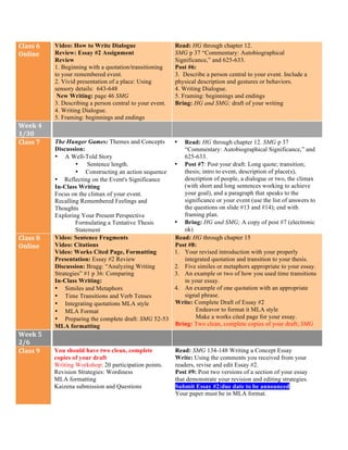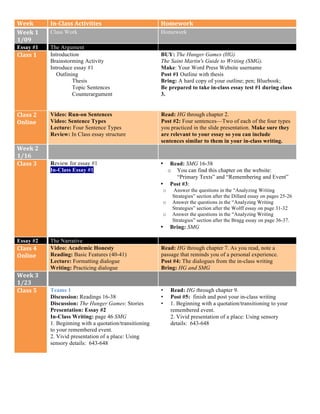 For each week, the document lists the in-class activities such as lectures, discussions, and writing exercises. It also provides the related homework assignments such as required readings, response posts, and draft submissions. The homework is designed to reinforce and extend the in-class lessons. Students are expected to write multiple drafts of each essay and receive peer feedback to improve their work prior to final submission.