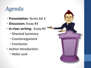 The document contains the agenda and materials for an English writing class. The agenda includes an in-class writing assignment on essay #3, which will involve a directed summary, counterargument, and conclusion. It then provides guidance on how to write each of these elements. For the directed summary, it explains that it should state the title and author, hook the reader with interesting details, include a brief plot summary to support the essay thesis, and clearly transition to the thesis statement. For the counterargument, it describes how to turn against the argument by acknowledging objections before turning back to reaffirm the thesis. Finally, it provides strategies for writing an effective conclusion that restates the importance of the thesis and gives the essay a sense of completeness