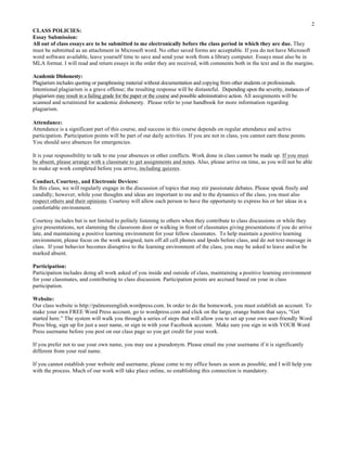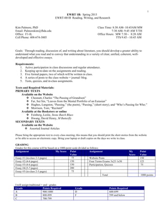 This document outlines the syllabus for an English composition course titled EWRT 1B: Spring 2013. It provides information about the course goals, requirements, texts, grading scale, policies, and logistics. Specifically, the course goals are to develop skills in understanding literature and conveying that understanding through essays. Requirements include participation, assignments, essays, blog posts, tests, and quizzes. The grading scale divides assignments into points that total to 1000 for the course. Various policies address essay submissions, academic dishonesty, attendance, conduct, late work, appointments, adding/dropping the course, and potential educational use of student papers.