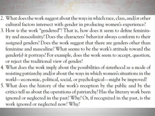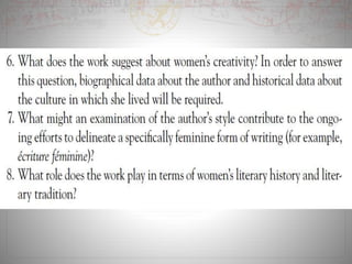 This document provides an agenda and content for an EWRT 1C class on literary theory and feminist criticism. It begins with an overview of intrinsic and extrinsic literary theories. It then discusses feminist criticism, noting its focus on exposing patriarchal influences and misogyny in literature. The document outlines the three waves of feminism and objectives of feminist criticism. It also analyzes Andrew Marvell's poem "To His Coy Mistress" from a feminist perspective.
