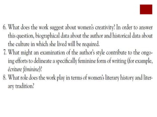 The document discusses a class on feminist criticism and Andrew Marvell's poem "To His Coy Mistress." It includes an agenda for the class that analyzes the poem using feminist criticism. It provides background on Andrew Marvell and discusses questions feminist critics ask about literary texts, such as how women are portrayed and if the work reinforces patriarchal ideology. It also includes the full text of Marvell's poem and discussion questions about analyzing it from a feminist perspective.