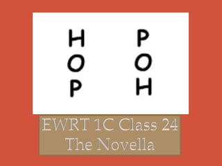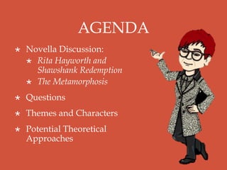 The agenda covers discussions of two novellas: Rita Hayworth and Shawshank Redemption and The Metamorphosis. For Shawshank, key themes of hope, struggle, and imprisonment will be analyzed. For The Metamorphosis, three chapter summaries are provided: Chapter 1 details Gregor waking up as a cockroach and his family's initial reaction. Chapter 2 explores Gregor's loneliness and his sister's compassion. Chapter 3 finds Gregor weakening as the family acclimates to his condition. Potential discussion questions are posed about characters and applying psychoanalytic theory.