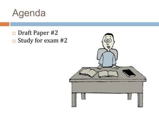 This document provides an agenda and notes for an English writing class. The agenda includes drafting the second paper, studying for the second exam, and discussing technical details of integrating quotations and citations into essays. The notes cover proper formatting for short and long quotes, summarizing sources, avoiding grammatical errors, MLA style guidelines, and exam #2 details. Students are reminded to email the professor if needing help and homework includes drafting paper #2 and studying for the upcoming exam.