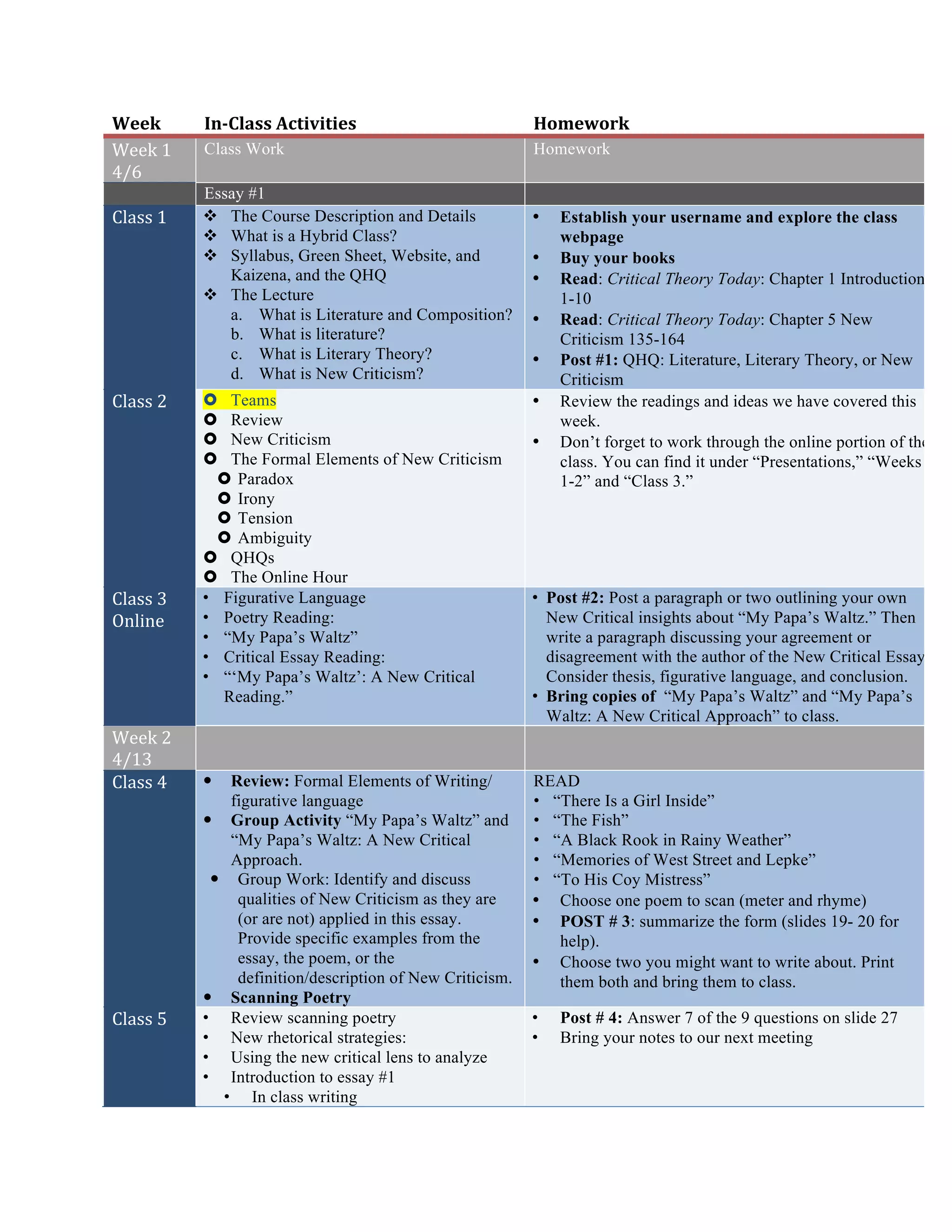 This document provides a weekly schedule for an English literature and composition class that is taught in a hybrid format. It includes the following: