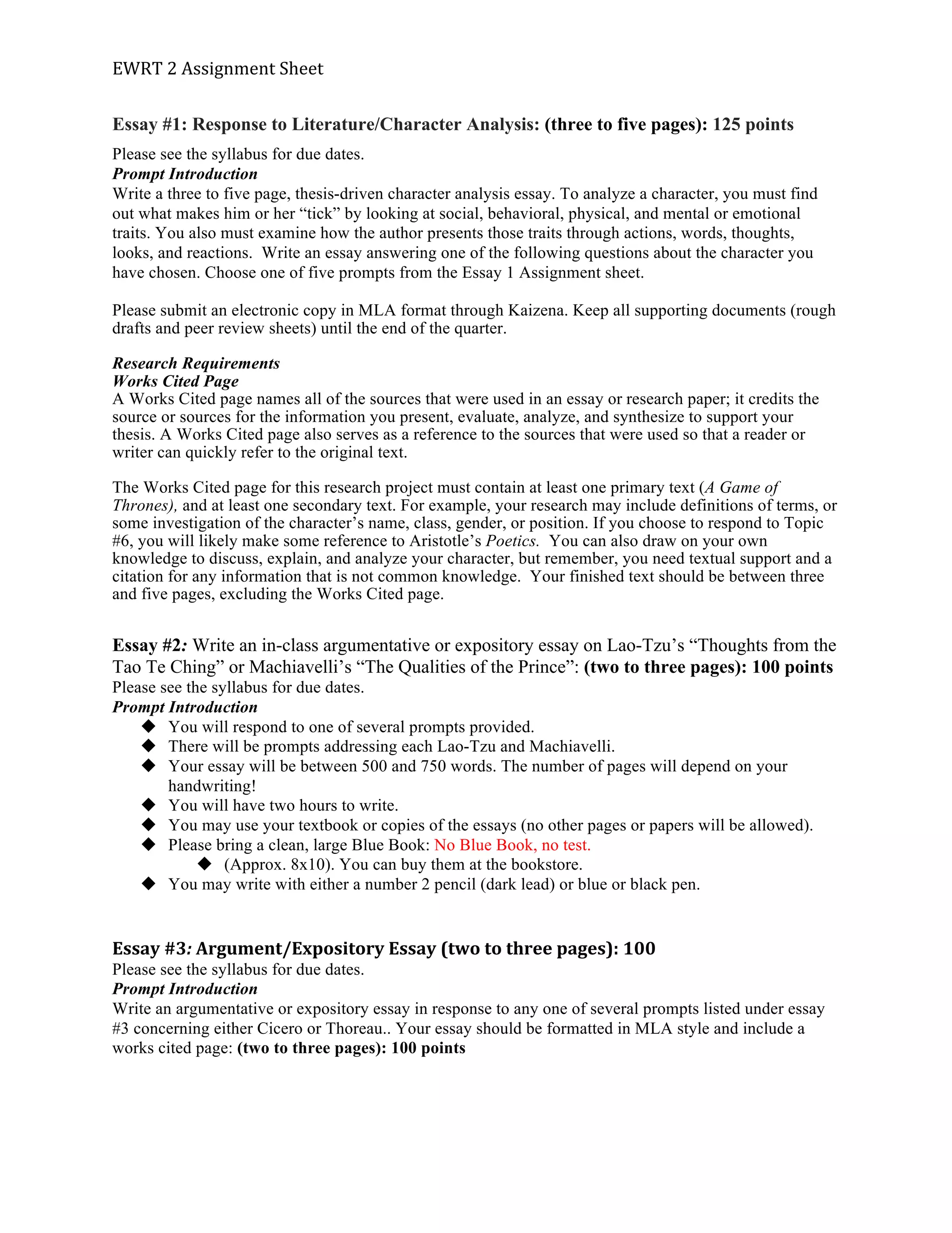 This document outlines the assignment requirements for an English writing course. It includes 5 essays of varying lengths that must be completed over the course of the quarter. Essay topics will explore characters from literature, philosophical texts, and include an in-class timed writing. Students will complete vocabulary tests, participate in class, submit reading responses online before each class, and write a final research paper integrating ideas from course texts and discussions. The course also involves workshops and quizzes, with grading based on rubrics for assignments, participation, and submitting work by deadlines.