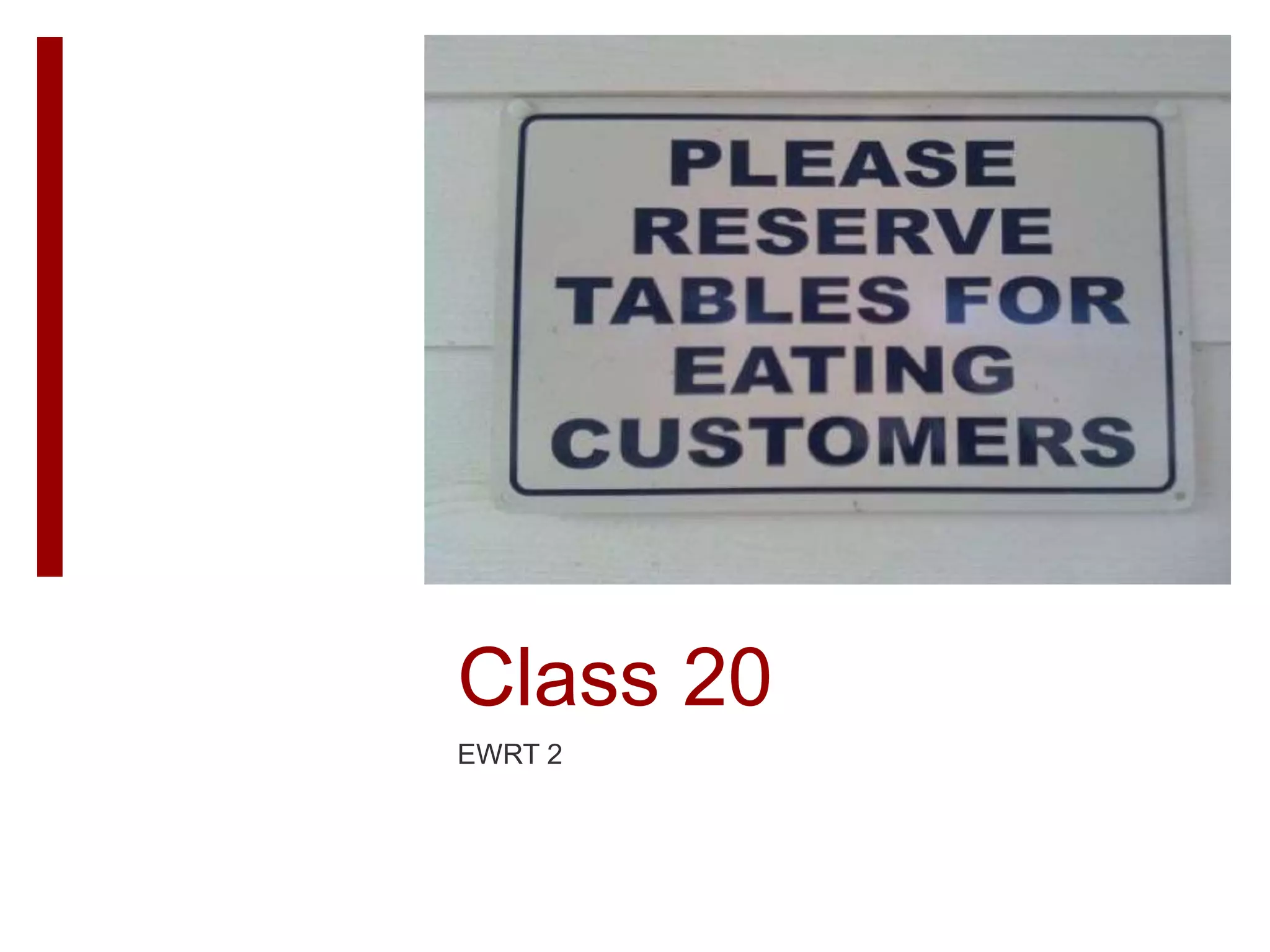 This document provides an agenda and information for Class 20 of an EWRT 2 course. It includes plans for a make-up vocabulary exam, an in-class self-assessment writing, and drafting Essay #5. It provides details on grading criteria and due dates. Students are instructed to write a thesis for Essay #5 on arguing an aspect of the prompt, and an outline is discussed. Homework includes finishing a revision, posting a thesis and outline, and signing up for a meeting before the final class.