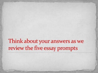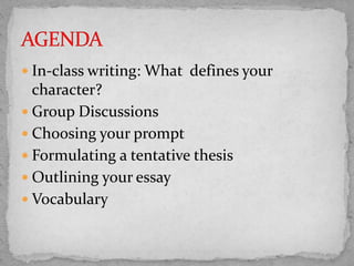 This document outlines the plan for a class focused on analyzing characters from A Game of Thrones. Students will write about what defines their chosen character, discuss in groups, and choose an essay prompt. They will formulate a thesis, outline their essay, and find evidence to support their points. Students will be placed into discussion groups focused on specific characters. The class will conclude by preparing for a vocabulary test on Tuesday.
