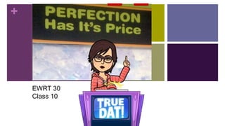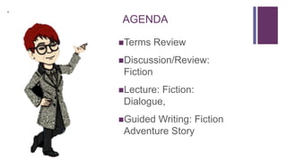 This document provides an agenda and lecture materials for an EWRT 30 class. The agenda includes reviewing terms related to fiction, discussing the short story "Chrysanthemums" by John Steinbeck, and guiding students in writing dialogue for a fiction adventure story. The document defines various fiction elements like plot, character, setting, tone, and point of view. It also discusses character analysis and characterization techniques. Guidelines are provided for writing effective dialogue, including reflecting a character's personality, using contractions, balancing dialogue with action, and maintaining a natural rhythm. Students are instructed to add dialogue to their adventure story drafts.