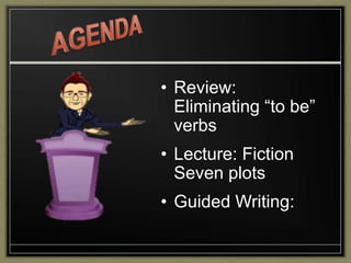 This document summarizes Christopher Booker's theory of the seven basic plots in storytelling. It discusses each of the seven plots - overcoming the monster, rags to riches, the quest, voyage and return, comedy, tragedy, and rebirth. For each plot, it provides a synopsis and typical examples. It also discusses how all stories incorporate universal elements of a hero's journey from an initial state of lack to a final resolution or transformation. The document concludes with prompting students to identify which plot their own writing incorporates and to outline or write a scene for their story.