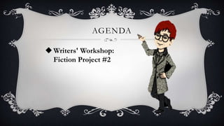The document outlines the agenda for EWRT 30 Class 16, which includes a writers' workshop for Fiction Project #2. Students will get into groups and share their fiction papers, including sending them to the instructor. They will take turns reading samples aloud and noting errors, then provide comments on content, style, and conventions using a handout as a guide. Comments should focus on areas for revision. Students will use the comment feature on Google Docs and submit Project #3 by Friday of week 9.