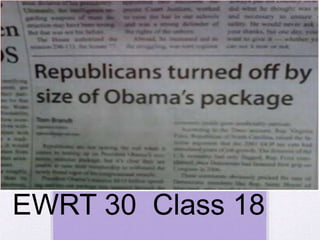 This document provides an agenda and information for an EWRT 30 class. It includes discussions on submissions to the Red Wheelbarrow literary magazine, upcoming assignments, terms for a drama test, and expectations for group projects. Students are instructed to submit creative works such as poems, stories, or plays to the magazine and given guidelines for submissions. Coming assignments include a terms test, working on group plays, and submitting a final portfolio. Guidelines are provided for self-assessing homework posts and calculating the grade. Students are also given rules, expectations, and suggestions for their group projects.