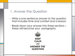 This document provides instructions for writing an extended response to a stimulus question in four paragraphs. It advises the writer to answer the question in one sentence with time, context and a reason, then break the answer into three sections to form the paragraphs. The writer should then read the sources, taking notes on content and writing critiques before selecting quotes to support each of the three sections. Finally, the document outlines how to structure the four paragraphs, with an introduction, three body paragraphs addressing each section, and a conclusion, while using sources correctly and critically.